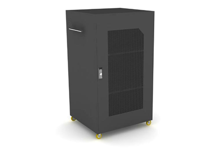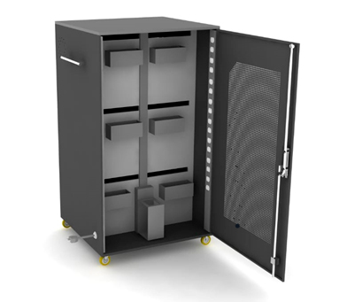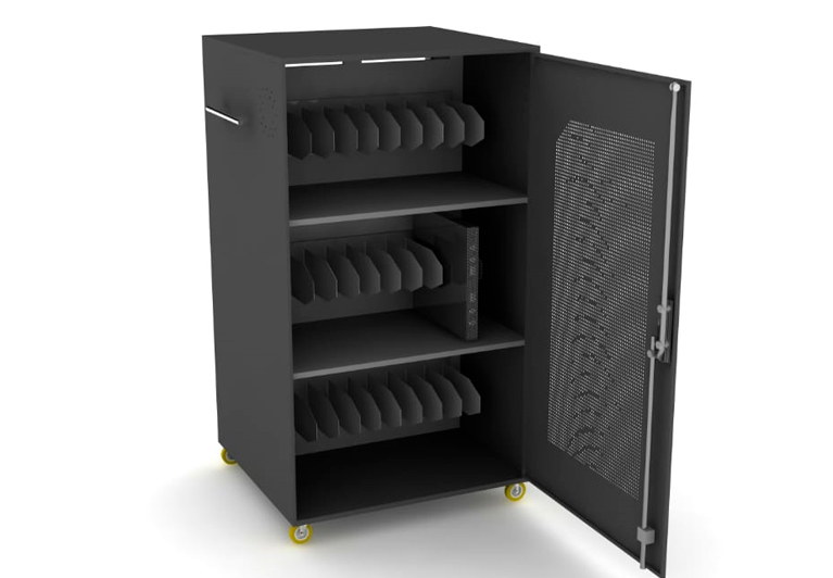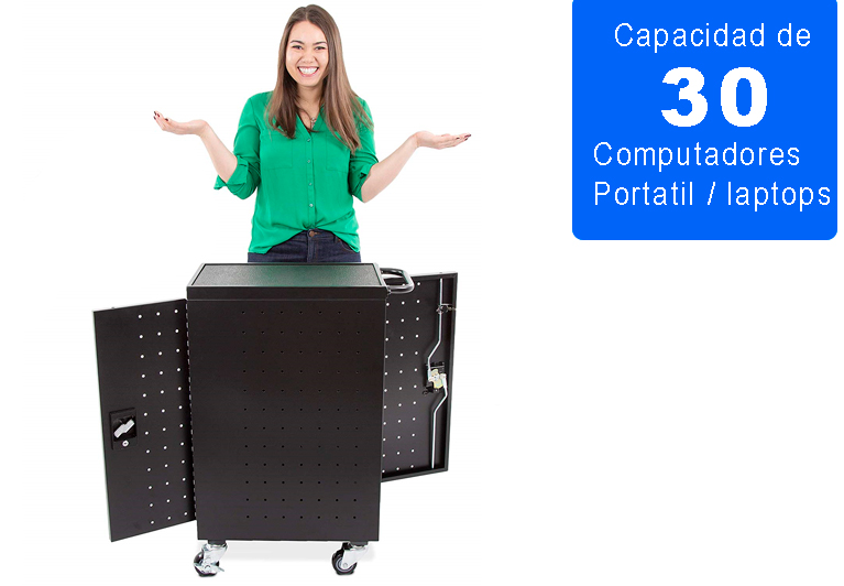 Mueble tipo armario movil para portatiles, cuenta con una estructura en su interior con bandejas fijas lo cual permite tener un amplio espacio para introducir hasta 30 computadores portatiles de forma facil y practica.
