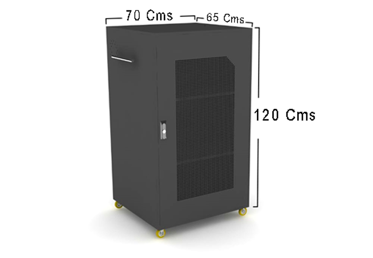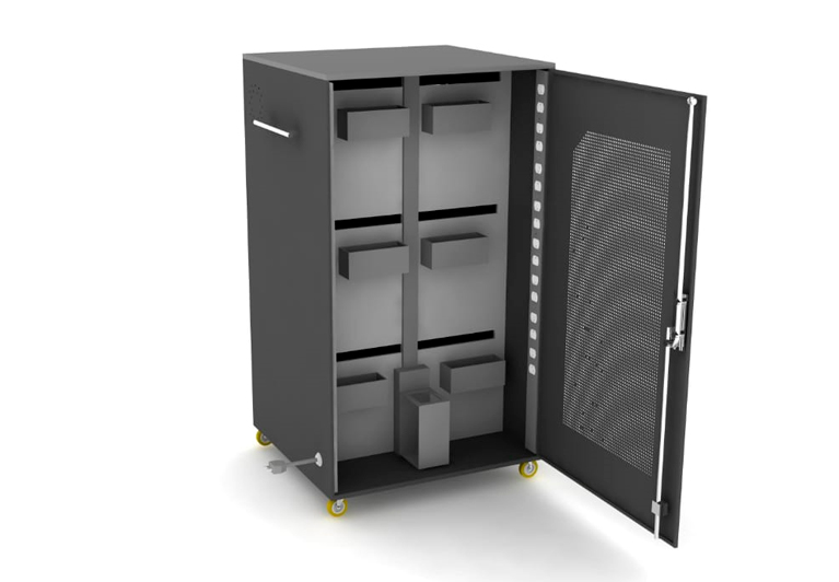 Su diseño cuenta con dos puertas de facil acceso, la delantera donde tendremos acceso a cada uno de los computadores o laptops de forma sencilla, la puerta trasera nos permitira solo tener acceso a las conexiones electricas, teniendo un diseño tipo cajetilla para alli almacenar los cargadores de los dispositivos