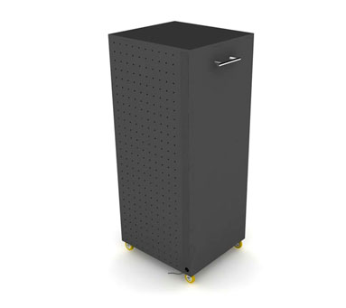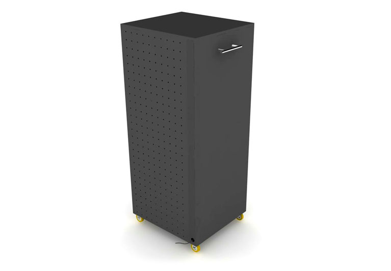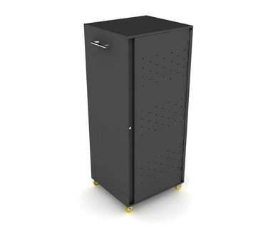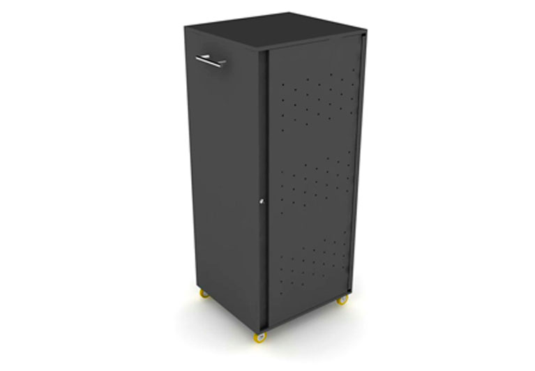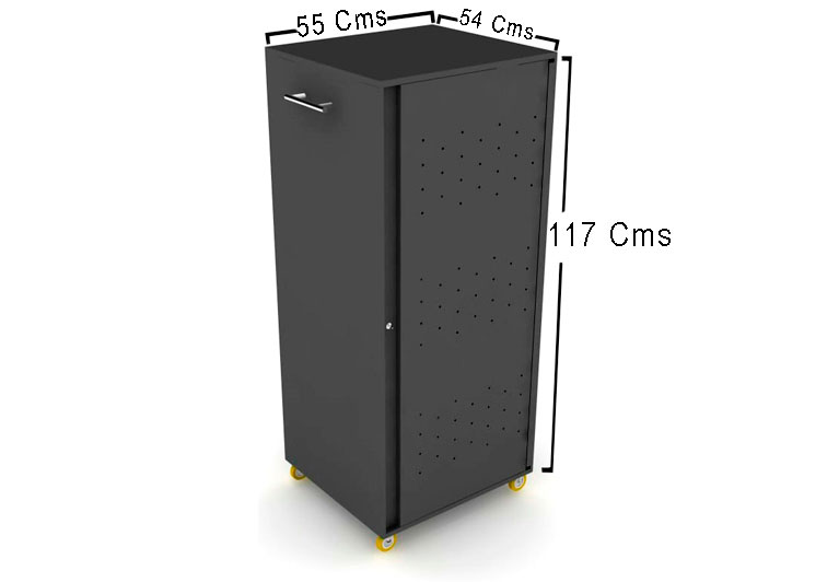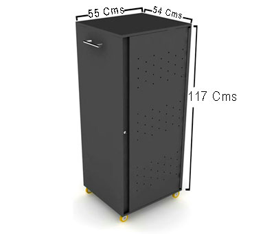 Mueble tipo armario con tomacorrientes en su interior, su diseño practico y elegante permitira al usuario tanto ingresar como sacar los computadores portatiles de forma organizada de cada una de sus bandejas.