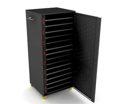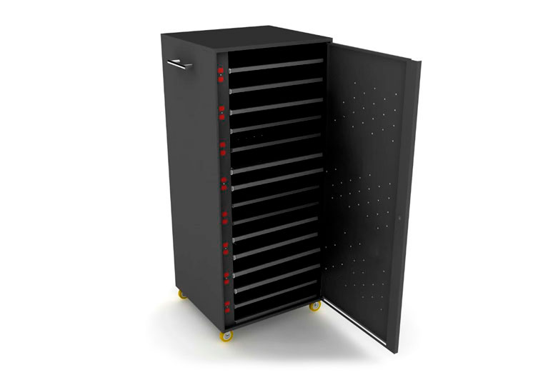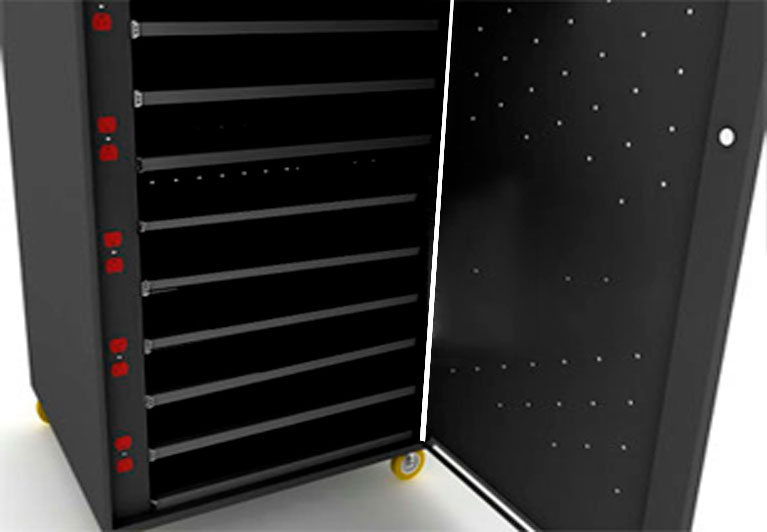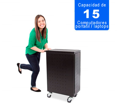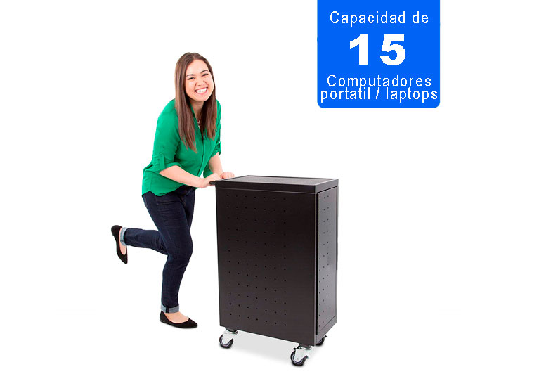 Cuenta con 15 bandejas fijas en acero de alta resistencia las cuales permiten al usuario acceder de forma facil a cada uno de los dispositivos asi mismo ponerlo a cargar y trasladarlos de un lado a otro de manera sencilla.